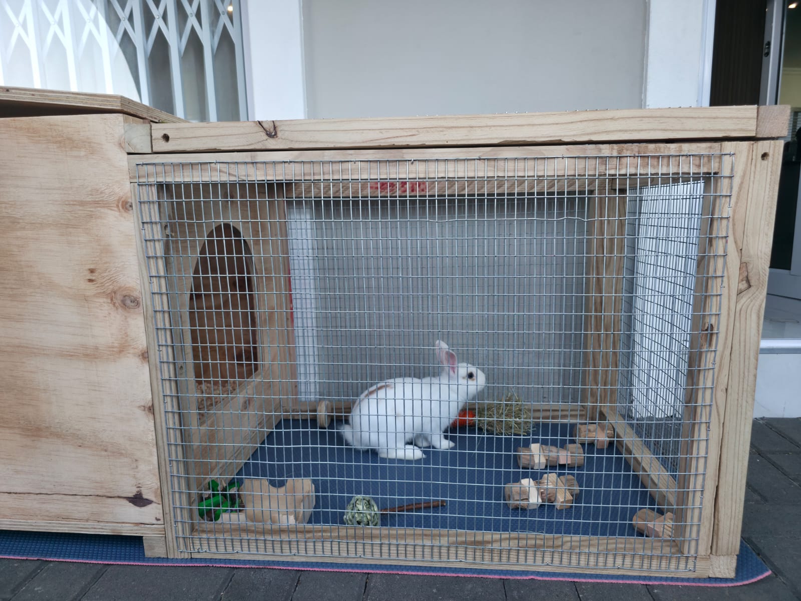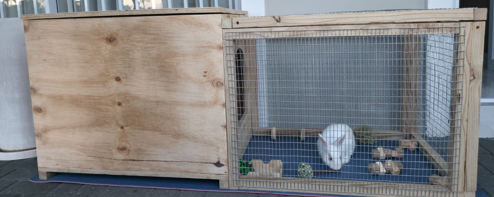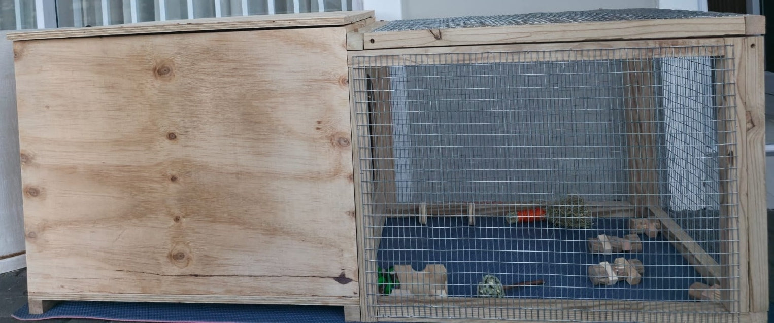 Give your beloved bunny the perfect blend of security, comfort, and space with Joshua's Pawtio Pad. Custom-built for durability and rabbit welfare, this hutch provides both a dark, private shelter and a spacious, airy run.